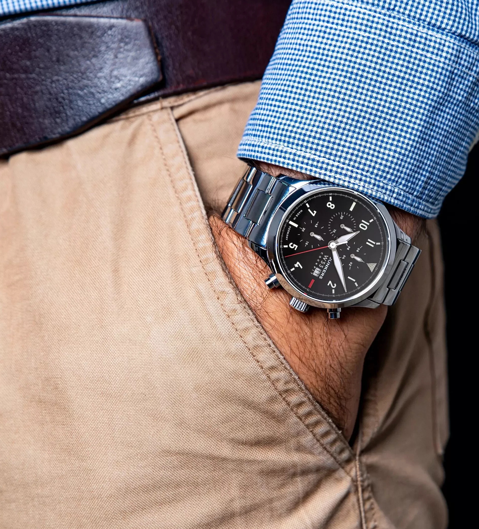 | Die Serie Junkers Cockpit zitiert mit Typografie und Zeigerform die klassischen Rundinstrumente der Flugzeuge jener Zeit. Alle Modelle sind Chronographen mit Leuchtmasse auf den Zeigern und bei den Modellen mit dunklem Zifferblatt zusätzlich auf den Indizes. Eine Junkers Cockpit zu tragen macht Sie nicht zum Piloten. Wir sind allerdings davon überzeugt, dass Sie das Gefühl erleben werden, wenn die Gegenwart modernen Designs mit der Ära der Luftfahrtpioniere eine Verbindung eingeht. Qualitätsarbeit MADE IN GERMANY |
