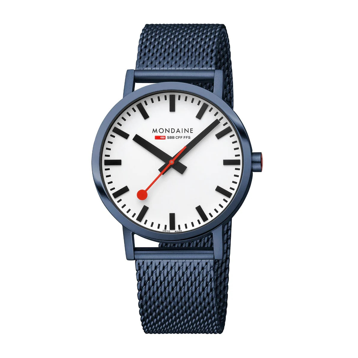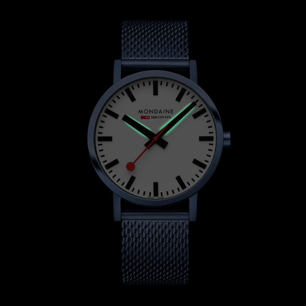 | Diese 40 mm Uhr kombiniert das ikonische Design der Schweizerischen Bundesbahnen mit einem IP-blauen Edelstahlarmband, das einen starken Kontrast zum strahlend weissen Zifferblatt bildet. Die charakteristischen schwarzen Stunden- und Minutenziffern und der berühmte rote Sekundenzeiger sorgen für gute Ablesbarkeit. Die Uhr verfügt über BackLight, eine patentierte Mondaine-Technologie, die das Ablesen der Uhrzeit auch im Dunkeln ermöglicht. Mit einem Gehäuse aus brossiertem Edelstahl und einem polierten oberen Ring verbindet diese Swiss Made Uhr minimalistische Eleganz mit Langlebigkeit. Das Schnellwechselsystem des Armbands macht es leicht, es jederzeit zu wechseln. |