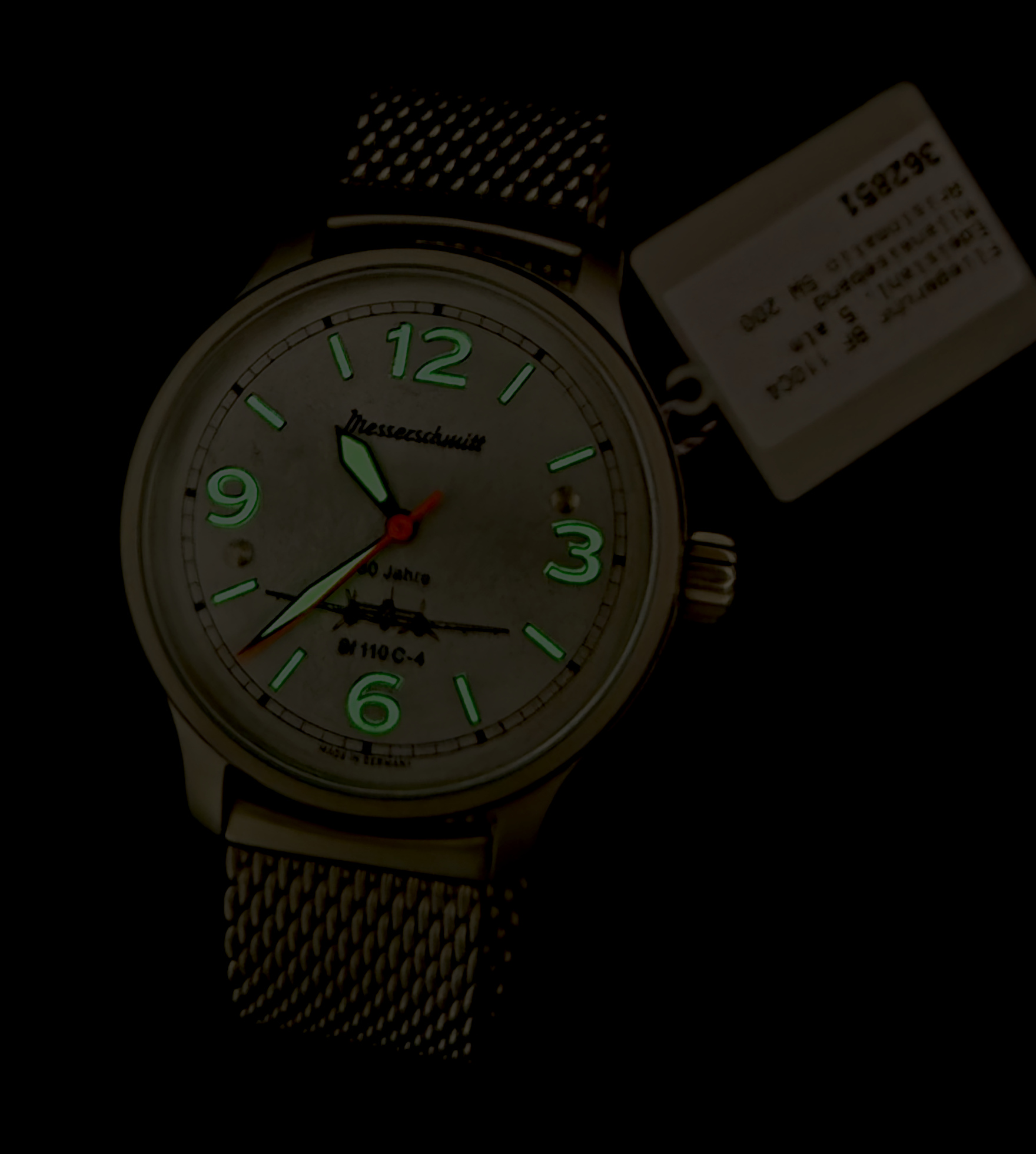 | Messerschmitt: 80 Jahre BF110 C-4 Limitiert auf 155 Uhren Ein Stück Zeitgeschichte für das Handgelenk Die Messerschmitt Bf 110 C-4 war ein zwei-motoriger Tiefdecker, der unter Regie der Messerschmitt Flugzeugwerke komplett aus Aluminium-Flugzeugblech gefertigt wurde. Die Fertigung des Sturmvogels erfolgte in den Jahren 1940/41 an den Standorten Gotha, Braunschweig und Bremen. Insgesamt wurden von diesem Flugzeugtyp 155 Stück gebaut. Das Flugzeug war anfangs für zwei Besatzungsmitglieder als Langstreckenbegleitjäger ausgelegt, für Anforderungen wie zur Aufklärung kam später eine dritte Person hinzu. Uhren mit Geschichte Die Fliegeruhr Messerschmitt Bf 110 ist eine Hommage an die Ingenieurskunst dieser Zeit. Bereits vor 80 Jahren wurden aus dem Leichtmetall Aluminium Flugzeuge gebaut. In einer auf 155 Stück limitierten Serie wird das Zifferblatt aus originalem Flugzeugblech gefertigt - exklusiv für Liebhaber und Sammler von Raritäten. Diese limitierte Fliegeruhr, als Hommage an den zweimotorigen Tiefdecker Messerschmitt Bf 110 C-4, ist ein Stück Zeitgeschichte am Handgelenk. Technische Daten: |