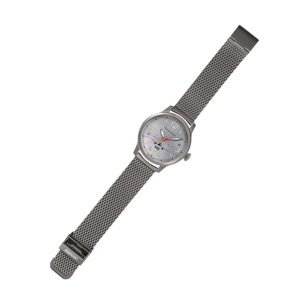 | Messerschmitt ME262-42Extrema Limitiert auf 262 Uhren Ref.: ME262-42Extrema Jede Uhr ein Unikat Original Flugzeugblech wurde bereits bei dem Vorgängermodell verwendet. Dieses Material stammt nachweislich aus der Fertigung der Messerschmitt ME 262 und sollte im ersten Düsenflugzeug der Welt verbaut werden. Das Aluminium hatte eine Patina angesetzt, die man bei einem anderen Material vorfindet. Durch Ausstanzen und Abdrehen im Bereich des Uhrwerks bekommt man die erforderliche Stärke von 0,40 mm. Befestigt wird das Zifferblatt auf dem Uhrwerk sichtbar von oben mit 2 Stahlschrauben. Ein altes Verfahren zum Härten und Vergüten von Stahl wurde angewandt, um das Uhrgehäuse zu veredeln. Diese Ausführung in Edelstahl brüniert ist eine absolute Neuheit im Uhrenbereich. Eine leicht braune Patina mit einem Mattschliff versehen, macht diese Uhrenmodelle zu Hinguckern. An allen Uhren dieser Ausführung wird eine sandgestrahlte Kegelkrone aus Edelstahl verwendet. Ein Saphirglas oben ist dabei selbstverständlich. Ausgestattet ist die ME262-42Extrema mit einem ebenfalls brünierten Milanaiseband aus der Metallband-Manufaktur Vollmer. Technische Daten: Gehäuse: Edelstahl sandgestrahlt Ø 42 mm und Band in brüniert, Höhe: 11 mm, Saphirglas, verschraubter Glasboden, Aluminium-Zifferblatt aus original Flugzeugblech mit Leuchtziffern und -zeiger, Sekunde in Leuchtorange, griffige Kegelkrone, 5 atm wasserdicht, Milanaiseband mit Si-Schließe, mit fortlaufender Seriennummer und auf 262 Stück limitiert, Schweizer Automatic-Werk ARISTOMATIC SW 200 |