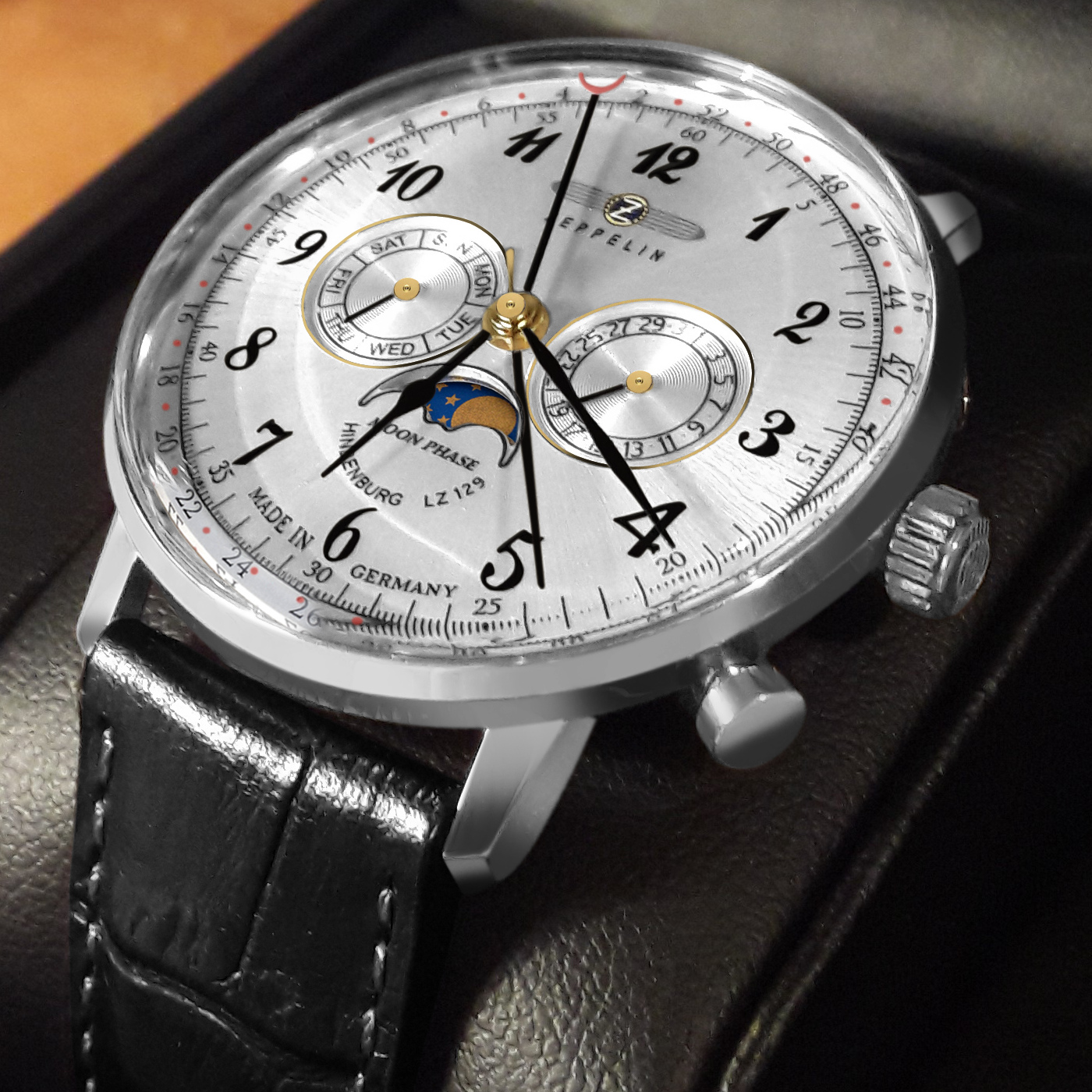 | Retro mit Charme – die Zeppelin Hindenburg besticht durch eine wunderschönen Mondphasen-Anzeige und ein fein gearbeitetes silbernes Sonnenschliff-Zifferblatt. Der Chronographen-Look aus Taganzeige, Datum und Mondphase bildet einen feinen stilistischen Kontrast zu dem betont klassischen Design - zusammen mit dem edel abgerundeten Glas ergibt das in der Summe eine klassische Vintage-Uhr, die trotzdem frisch und modern wirkt. Den letzten Schuss Noblesse verleiht diesem Schmuckstück der rote Sichelzeiger, der am Rand des Zifferblatts die Kalenderwoche anzeigt. Möglich macht dies ein spezielles Ronda-Quarzwerk aus der Schweiz, welches in einem Gehäuse aus poliertem Edelstahl tickt. Die ZEPPELIN Hindenburg Mondphase machen dank ihrem Durchmesser von 40mm auch an Damen- oder schmäleren Herren-Handgelenken eine ausgezeichnete Figur, auch durch das handgearbeitete Lederarmband aus deutscher Produktion. |
